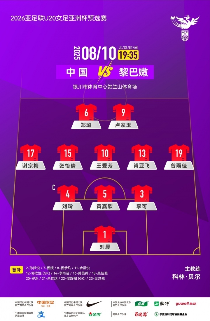 中国女足U20vs黎巴嫩女足首发:卢家玉、王爱芳先发,郑璐出战